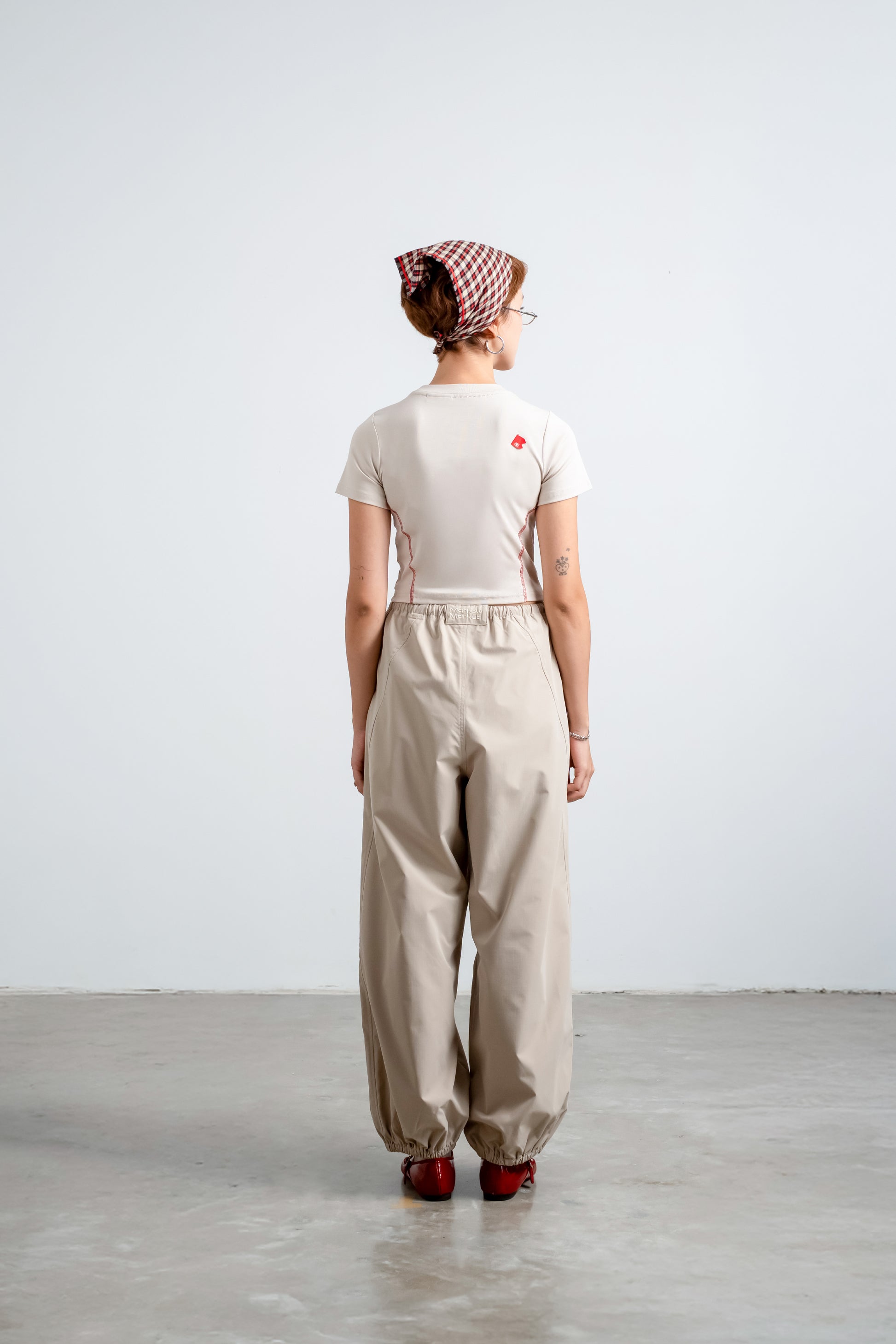 A fitted baby tee, designed with cut & sew paneling and red stitching to contour the natural silhouette.